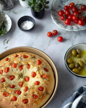 Wir backen leckere Focaccia mit kleinen Cherrytomaten, perfekt für ein leichtes Abendessen mit Salat, Oliven und köstlichen Dips. Focaccia ist recht unkompliziert in der Zubereitung und ihr braucht- neben einem guten Olivenöl - nicht viele Zutaten.