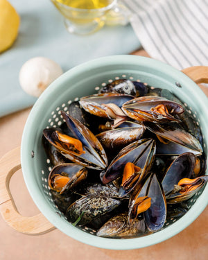 Meeresfrüchte anbraten: In einer großen Paella-Pfanne bei mittlerer Hitze etwas Olivenöl erhitzen. Die geputzten Meeresfrüchte kurz anbraten und mit Salz und Pfeffer würzen. Beiseitestellen.