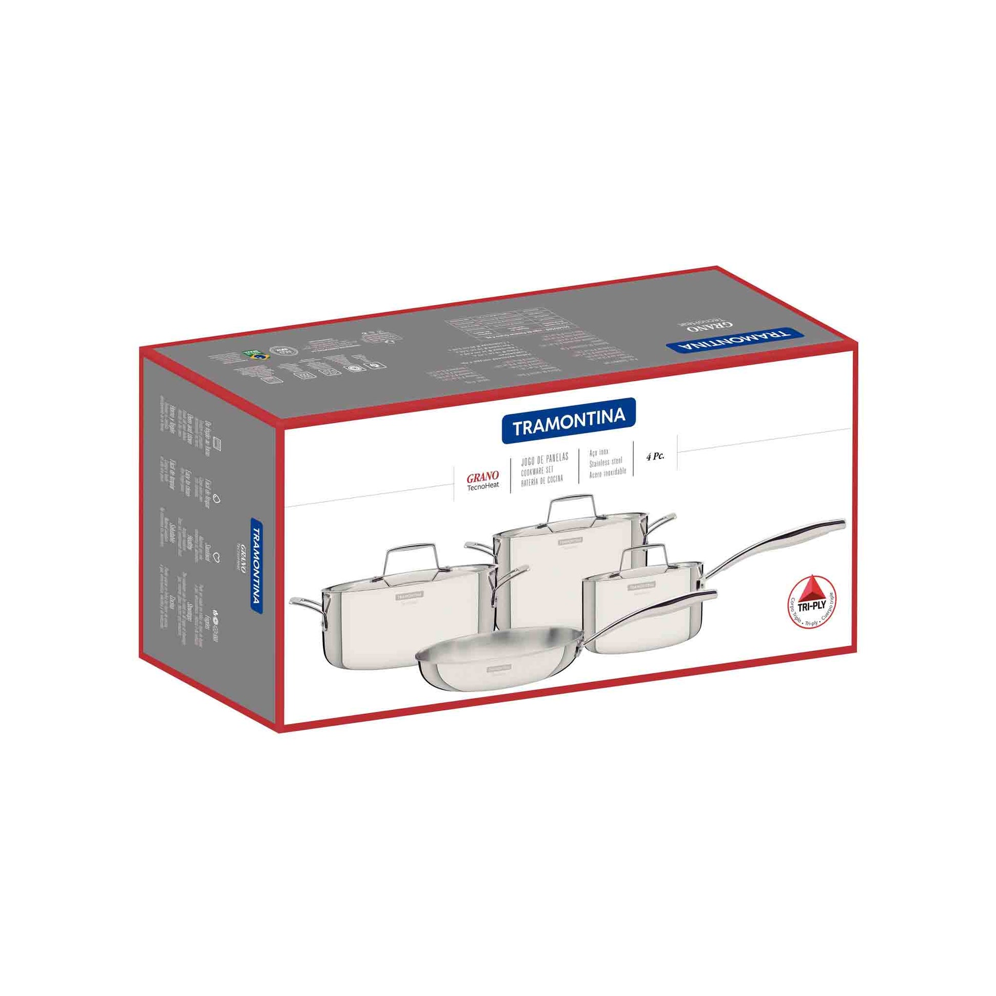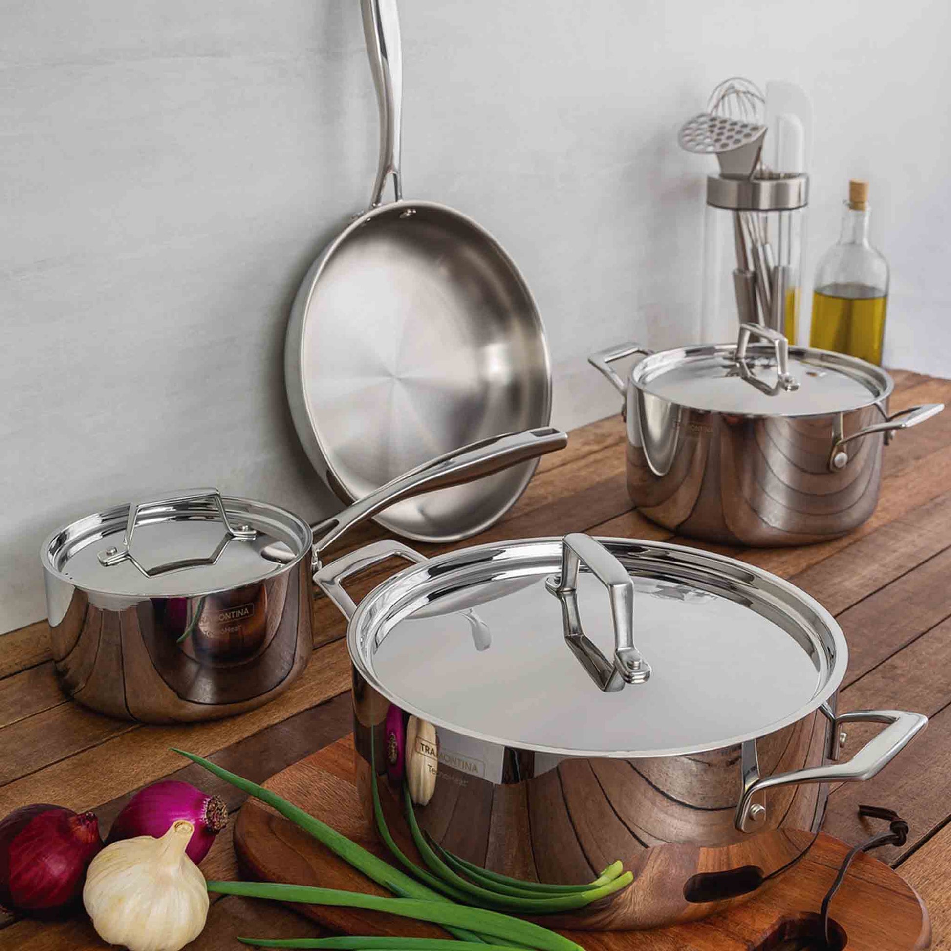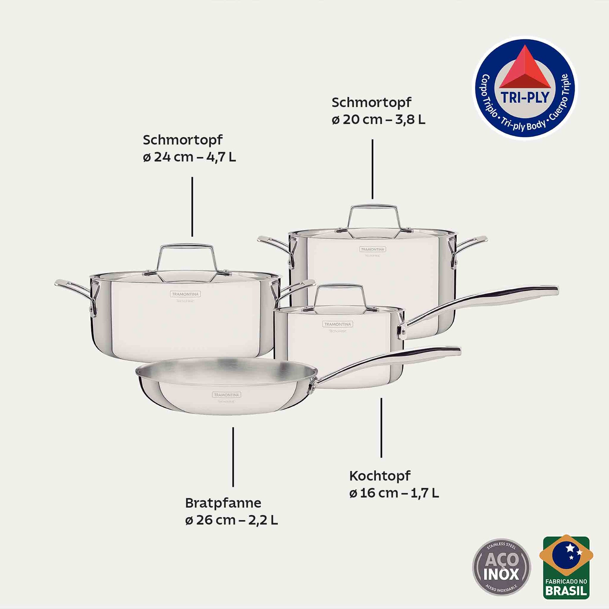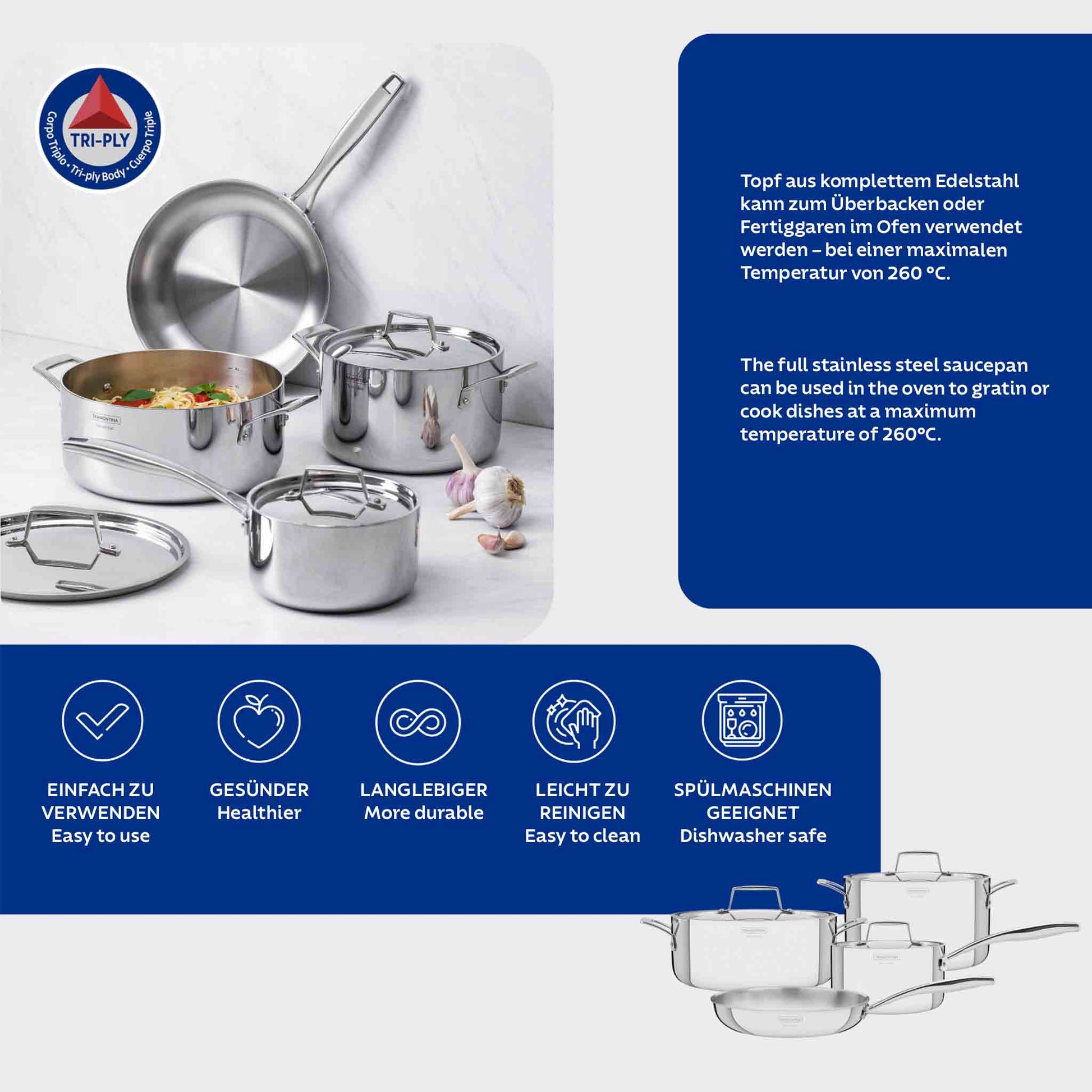 Dieses hochwertige 4-teilige Kochtopfset aus rostfreiem Edelstahl 18/10 vereint zeitloses Design mit herausragender Funktionalität und ist die perfekte Ausstattung für jede Küche. Dank seines energiesparenden Dreischichtbodens (Tri-Ply-Boden) sorgt das Set für eine gleichmäßige Wärmeverteilung und optimale Kochergebnisse auf allen Herdarten inklusive Induktion.i