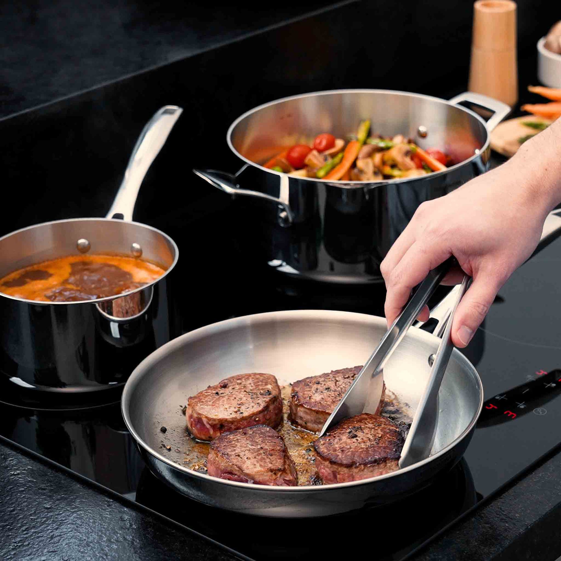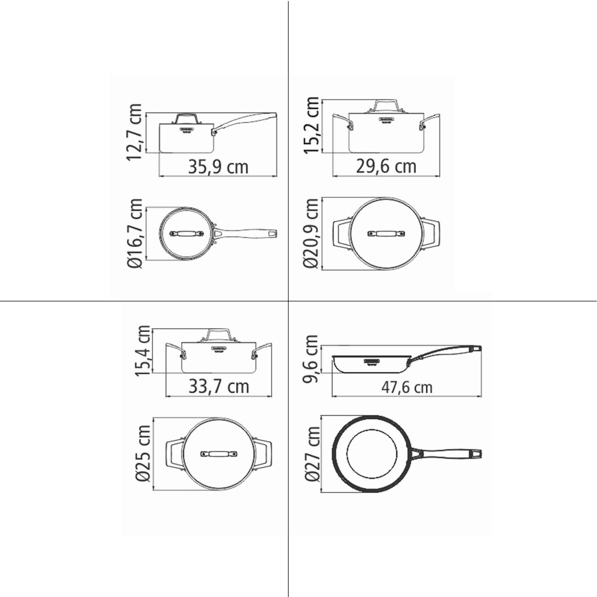 Das Set besteht aus drei Kochtöpfen mit passendem Deckel und einer vielseitigen Bratpfanne. Der große Kochtopf mit 24 cm Durchmesser und 4,7 l Fassungsvermögen eignet sich ideal für Suppen oder Eintöpfe, während der 20 cm Kochtopf mit 3,8 l perfekt für Beilagen ist. Der Saucentopf (16 cm, 1,7 l) ermöglicht das präzise Zubereiten von Saucen oder kleinen Portionen, und die Bratpfanne (26 cm) ist ideal zum scharfen Anbraten von Fleisch, Gemüse oder Fisch.