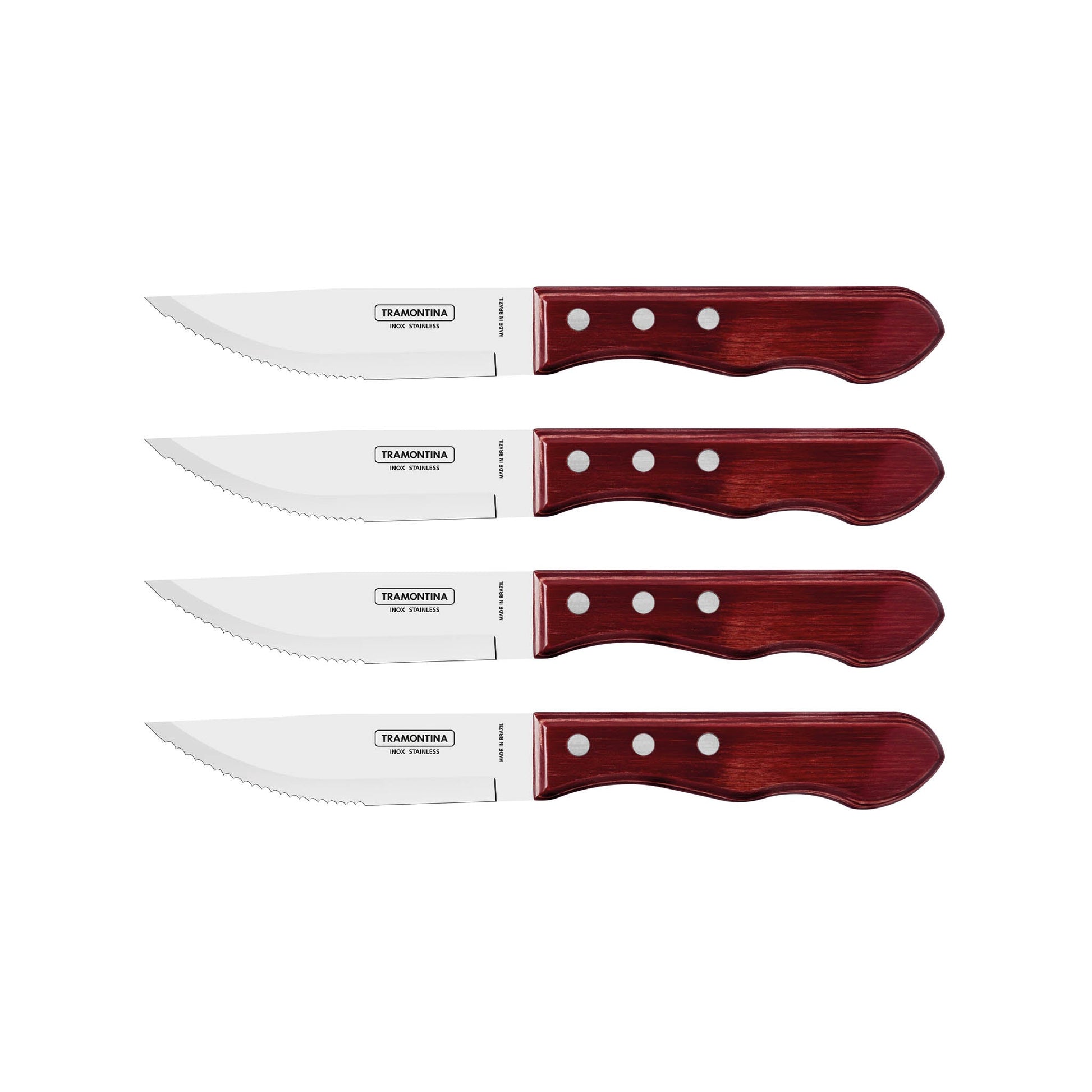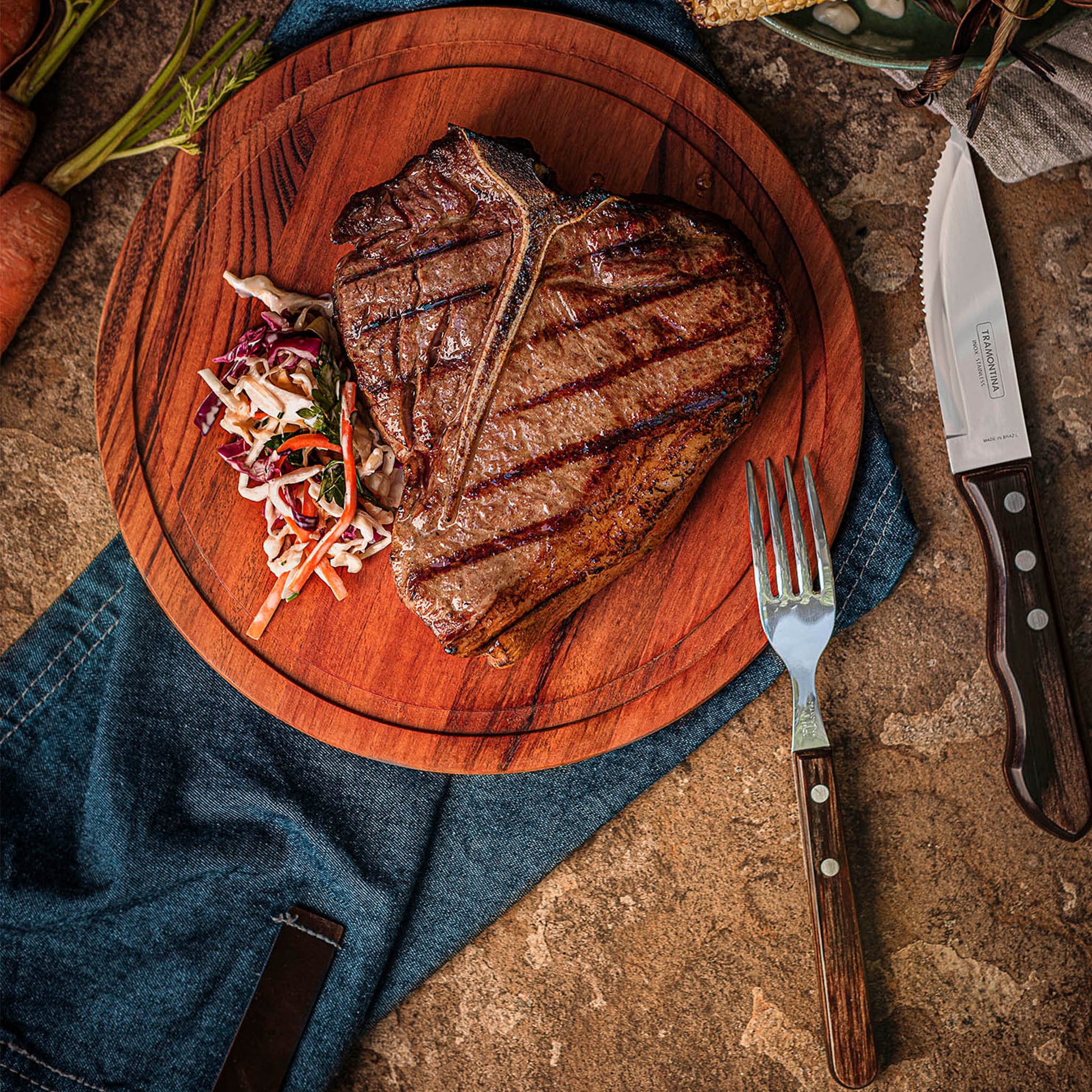 Tramontina gewährt auf das spülmaschinenfeste Steakbesteck mit Echtholzgriff und Edelstahlnieten eine Garantie von fünf Jahren gegen Fertigungsmängel.