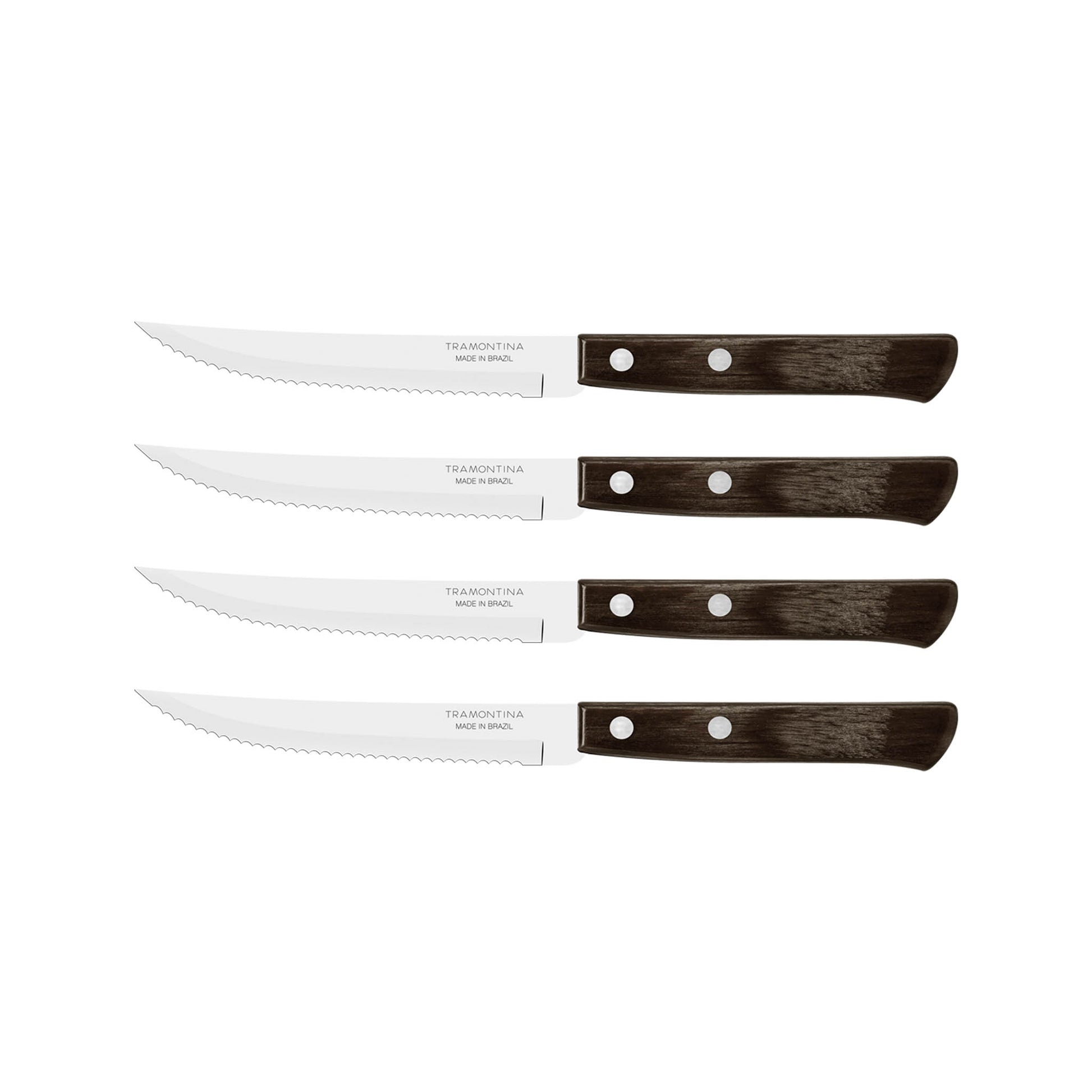 Tramontina gewährt auf das spülmaschinenfeste Steakbesteck mit Echtholzgriff und Edelstahlnieten eine Garantie von fünf Jahren gegen Fertigungsmängel.